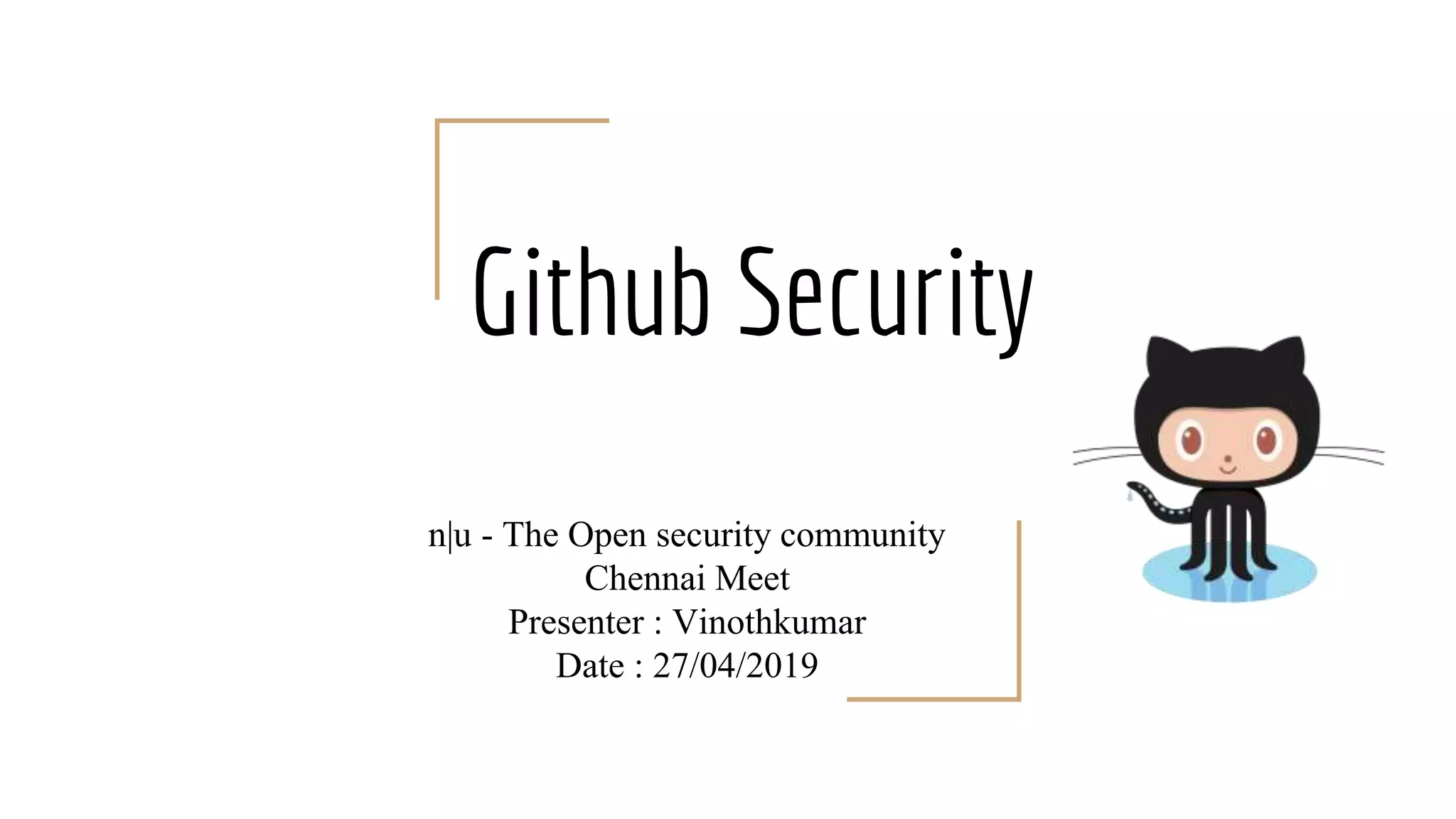 The document presents a session on GitHub security, covering its basics, usage for bug bounty hunting, securing wikis and forked repositories, and the importance of security audit logs. It discusses tools like Gitrob and Git Secrets for pre and post-commit checks, and emphasizes best practices such as avoiding credential storage in code and regularly auditing projects. The session is led by Vinothkumar, an application security engineer, and aims to enhance GitHub users' awareness of security measures.
