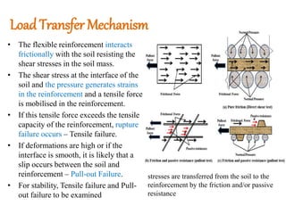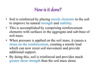 The document describes how soil reinforcement works. Tensile elements are placed in the soil to improve its strength and stability. When pressure is applied, it causes strain on the reinforcement elements, creating tensile loads that resist soil movement. This provides greater shear strength than soil alone. The reinforcement interacts frictionally with the soil to resist shear stresses, transferring loads from the soil. If tensile or pull-out failures occur, the stability is examined. Common reinforcement materials include strips, sheets, grids and geosynthetics made of polymers, steel or natural materials.