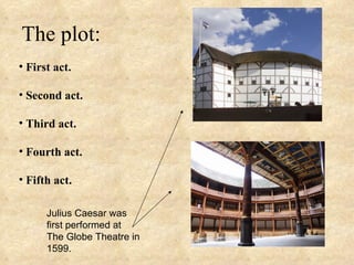 The document provides context and summaries for William Shakespeare's play Julius Caesar. The play is set in 44 BC Rome and depicts the conspiracy against Julius Caesar led by Brutus and Cassius. It is divided into five acts that show Caesar's assassination, the aftermath and consequences, including Antony turning the crowds against the conspirators and their eventual defeat in the battle of Philippi. The play examines themes around political power, virtue, and the conflict between honor and ambition. It also serves as a commentary on strong rulers and the importance of order during Elizabethan times.