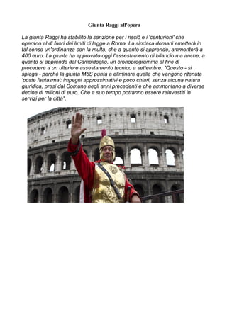 La giunta Raggi ha annunciato una multa di 400 euro per risciò e 'centurioni' che operano illegalmente a Roma. Inoltre, è stato approvato un assestamento di bilancio e un cronoprogramma per un ulteriore assestamento tecnico a settembre, mirato a rimuovere 'poste fantasma' dai conti del comune. Queste misure potrebbero liberare fondi significativi per reinvestire in servizi per la città.