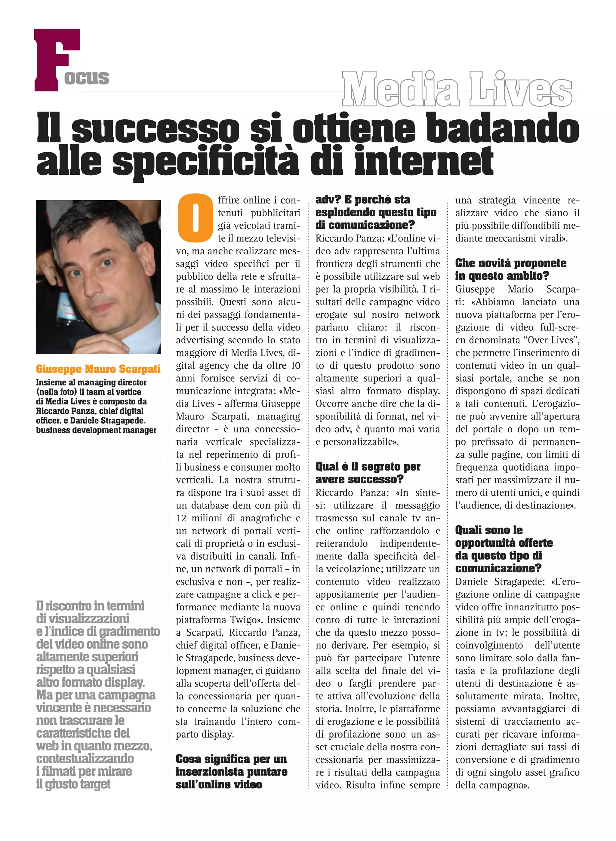 Il documento discute l'importanza della pubblicità video online, evidenziando come le strategie virali e le piattaforme specializzate possano massimizzare l'engagement e la visibilità del pubblico. Riccardo Panza e Giuseppe Mauro Scarpati descrivono le innovazioni nella pubblicità video e come la profilazione degli utenti e le interazioni siano cruciali per il successo delle campagne. Viene presentata una nuova piattaforma chiamata 'over lives' che offre un'erogazione flessibile e personalizzata dei contenuti video.