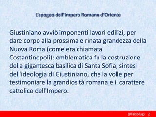 Giustiniano salì al trono nel 527 e avviò una serie di riforme e conquiste per rinvigorire l'impero, tra cui la costruzione della basilica di Santa Sofia e guerre contro i Vandali e gli Ostrogoti. Nonostante il costo di queste guerre fosse enorme, Giustiniano cercò di consolidare il potere imperiale attraverso riforme legali, culminando nel Corpus Iuris Civilis, che influenzò profondamente la giurisprudenza europea. Tuttavia, le difficoltà economiche e la scarsità di risorse resero il mantenimento dei territori acquisiti sempre più insostenibile.