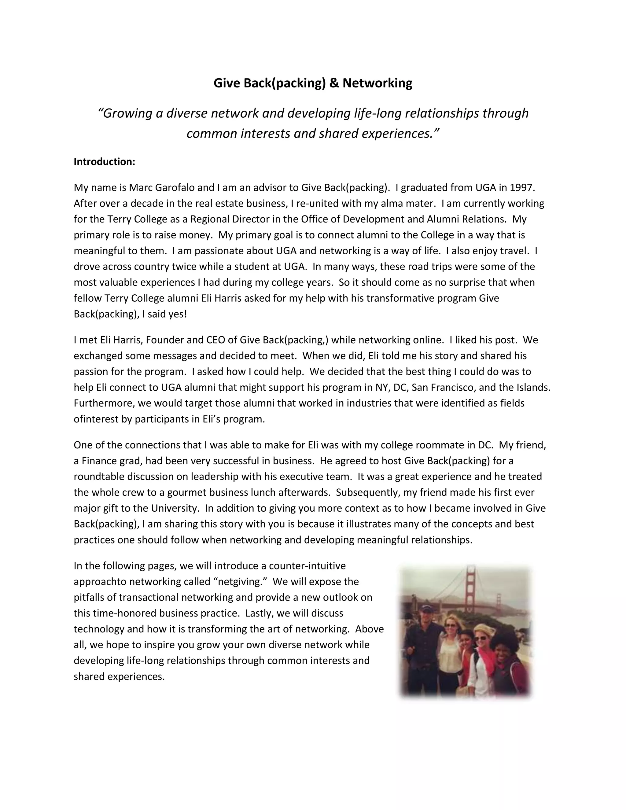 This document discusses networking and how to effectively grow one's network. It introduces the concept of "netgiving", which is asking what you can do for your contacts rather than what they can do for you. It emphasizes developing meaningful relationships through shared interests and experiences. The author became involved with the program Give Back(packing) after meeting the founder Eli Harris and seeing his passion for the program. The author provides networking advice including developing one's personal brand and utilizing tools like LinkedIn to enhance networking. The overall message is about cultivating productive relationships through common ground and mutual benefit.