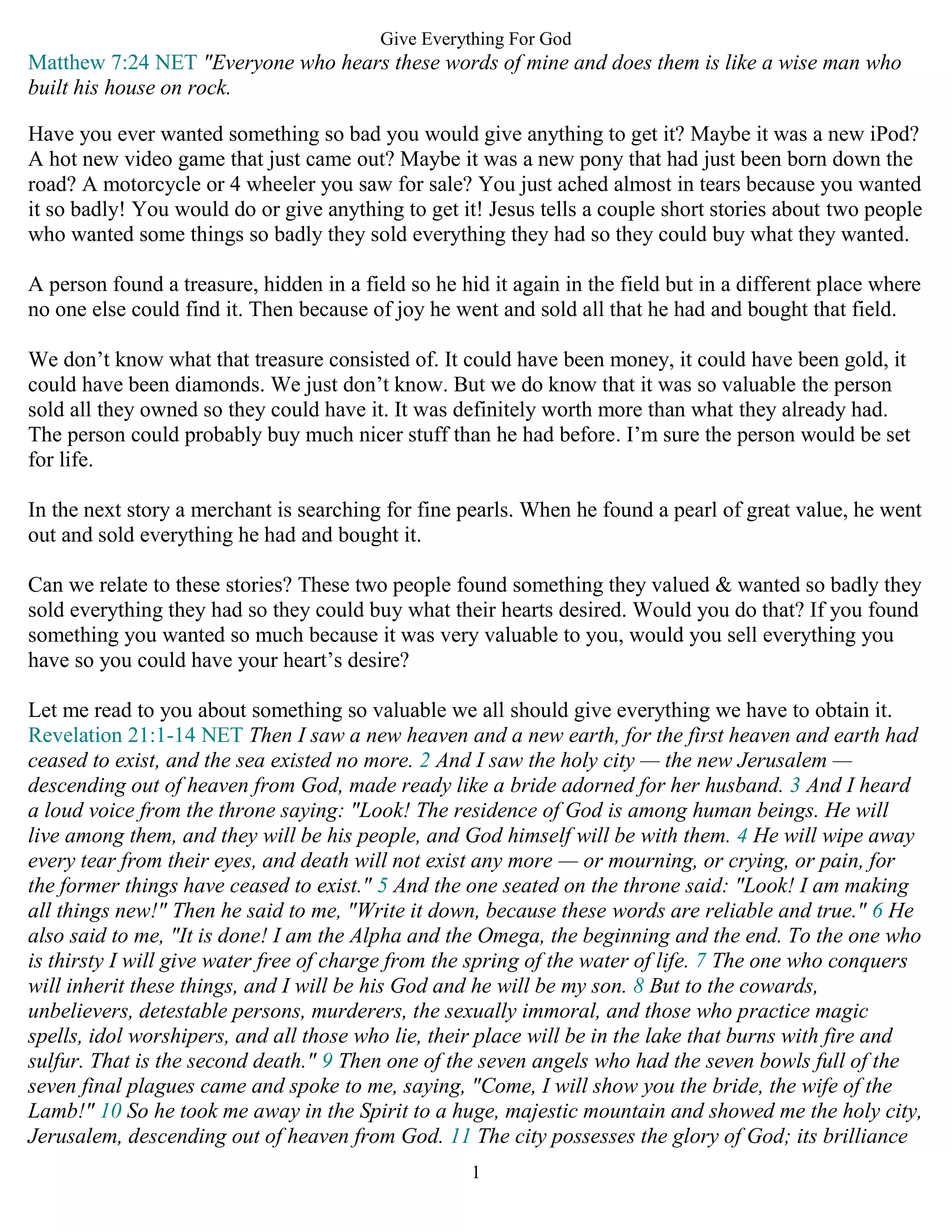 1) The document discusses two parables from the Bible where people sell everything they have to obtain a treasure and pearl of great value.