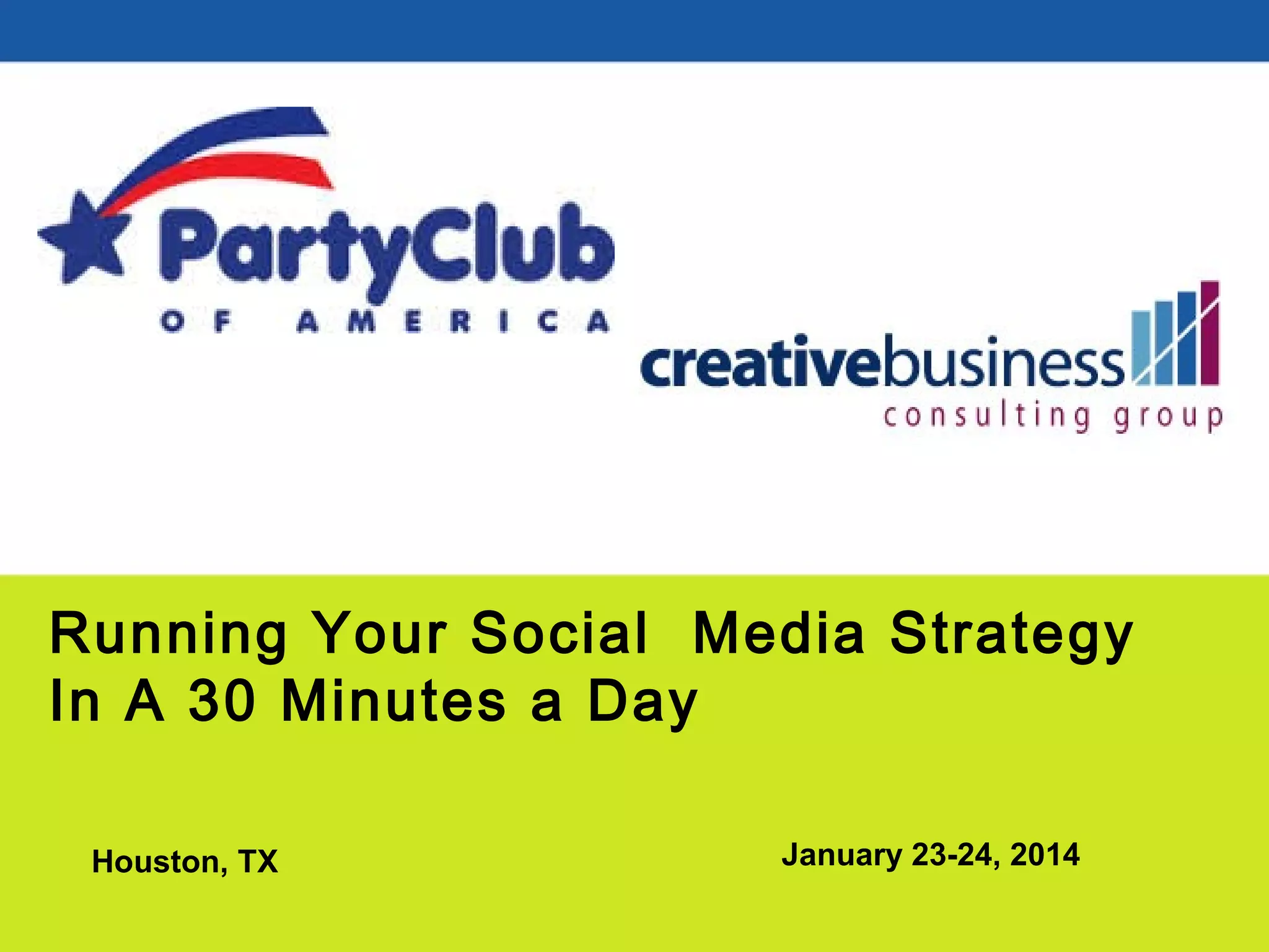 The document outlines strategies for running an effective social media strategy in 30 minutes per day. It recommends focusing on people, objectives, and strategy using the POST technique: