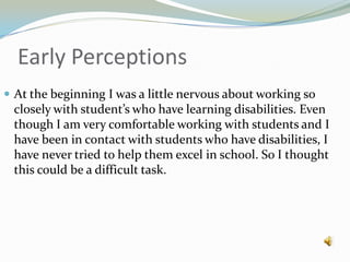 - The author was initially nervous about working closely with students who have learning disabilities but kept an open mind and prepared herself for challenges.