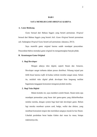 Dokumen tersebut merangkum perjalanan penulis dari seorang gamer bajakan menjadi gamer original. Penulis awalnya hanya memainkan game bajakan karena lebih murah, namun kemudian tergerak untuk beralih ke game original setelah mengalami berbagai pengalaman berharga di Gamers_ID seperti mendapatkan game gratis melalui give away. Penulis kini menghargai jerih payah para developer game dan menyadari pentingnya mendukung game original