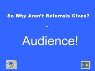 The document outlines strategies for effective networking and referrals presented by Judy Bragg during a workshop. It emphasizes the importance of preparation, meaningful conversations, and proper follow-up to facilitate successful referrals. Key elements include understanding each other's businesses, maintaining good meeting manners, and recognizing what constitutes a quality referral.