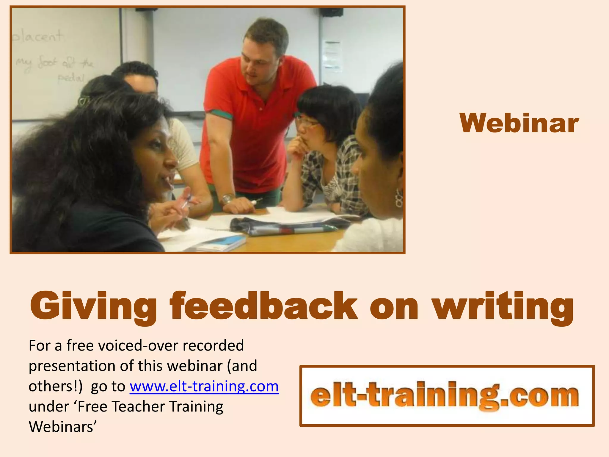 The document discusses the importance of writing feedback in education, focusing on various methods such as direct and indirect feedback, and correction codes. It highlights why students write, the benefits and drawbacks of different feedback approaches, and emphasizes the need for focused correction to aid learners in recognizing and addressing errors. The webinar also encourages the use of logbooks to track common mistakes and suggests strategies for effective feedback delivery.