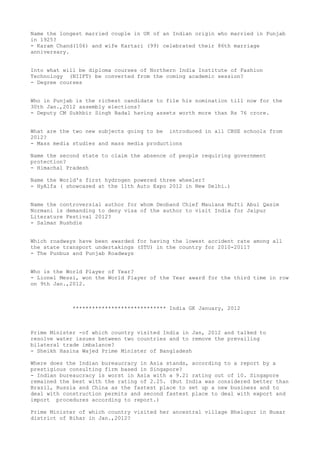 Bajaj Auto unveiled its ultra low cost car RE60 with a top speed of 70 Km/h and mileage of 35 Kmpl. Anup Kumar of Andhra Pradesh and Ashu Raj of Uttarakhand won the men's and male junior categories of the National Ice Skating Championship in Shimla. The US State Department posted a new map of India showing Jammu and Kashmir with a dotted line, projecting it as a disputed territory. It is possible to book train tickets on a cell phone by registering and downloading suitable software, and tickets can be shown via SMS confirmation. Rajasthan is creating a network of informers to address the dismal sex ratio, rewarding them for information leading to prosecution of