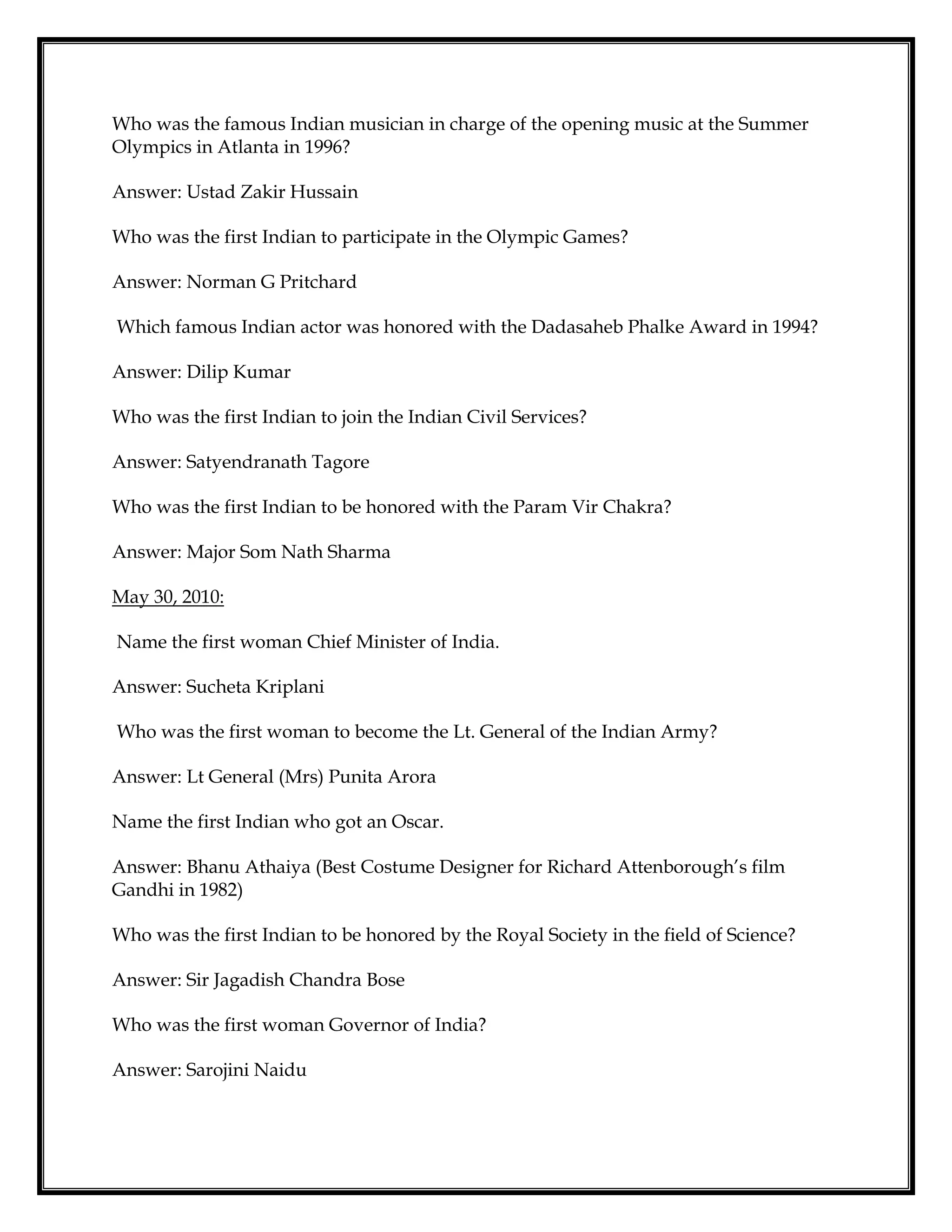 This document contains questions and answers related to various "firsts" and notable people and events in India. It includes the first Indian musician to receive an award, the first woman governor, the first Indian to climb Mount Everest without oxygen, and others. The document is a compilation of information asked and answered on different dates ranging from May 2010 to May 2020.