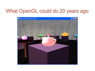 This document provides an overview of shader programming in OpenGL and GLSL. It discusses how shaders have evolved over the past 20 years to allow for more customization of vertex and fragment processing. It introduces the basic concepts of vertex and fragment shaders, and how they are used together in a shader program to control the graphics pipeline. It also covers the GLSL language syntax and basics types like vectors and matrices that can be used in shaders.