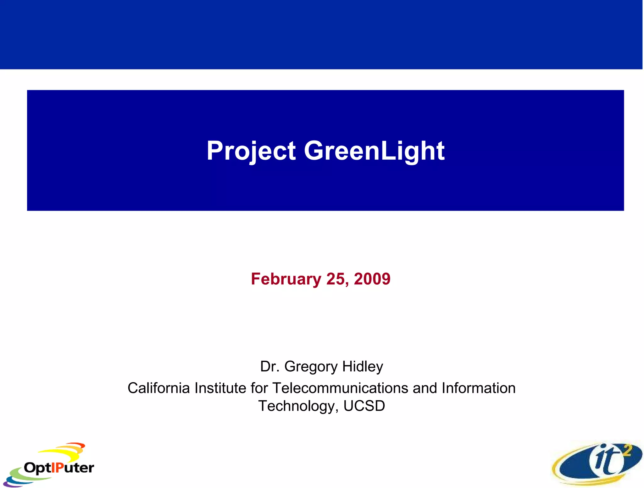 The document discusses the GreenLight project which aims to minimize the energy consumption of computational resources through several methods. It plans to instrument compute and storage infrastructure to measure and control energy usage, develop software to optimize resource allocation, and explore using renewable energy sources like solar power. The goals are to allow scientists to study the energy costs of large-scale computing and develop more efficient deployment strategies and architectures.