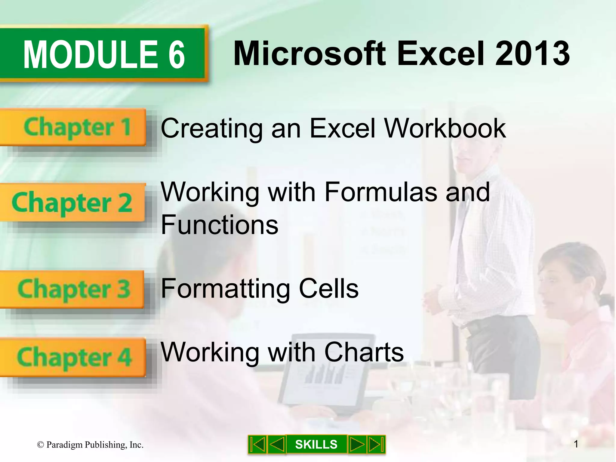 This document discusses working with charts in Microsoft Excel 2013. It covers how to create different types of charts, including pie charts, line charts, column charts, and bar charts. It also describes how to modify existing charts by changing the data range, editing labels, rotating or exploding pie slices, modifying the legend position, and applying different styles. The skills covered include creating and customizing various chart types as well as adding and editing chart elements like titles, labels, and legends.