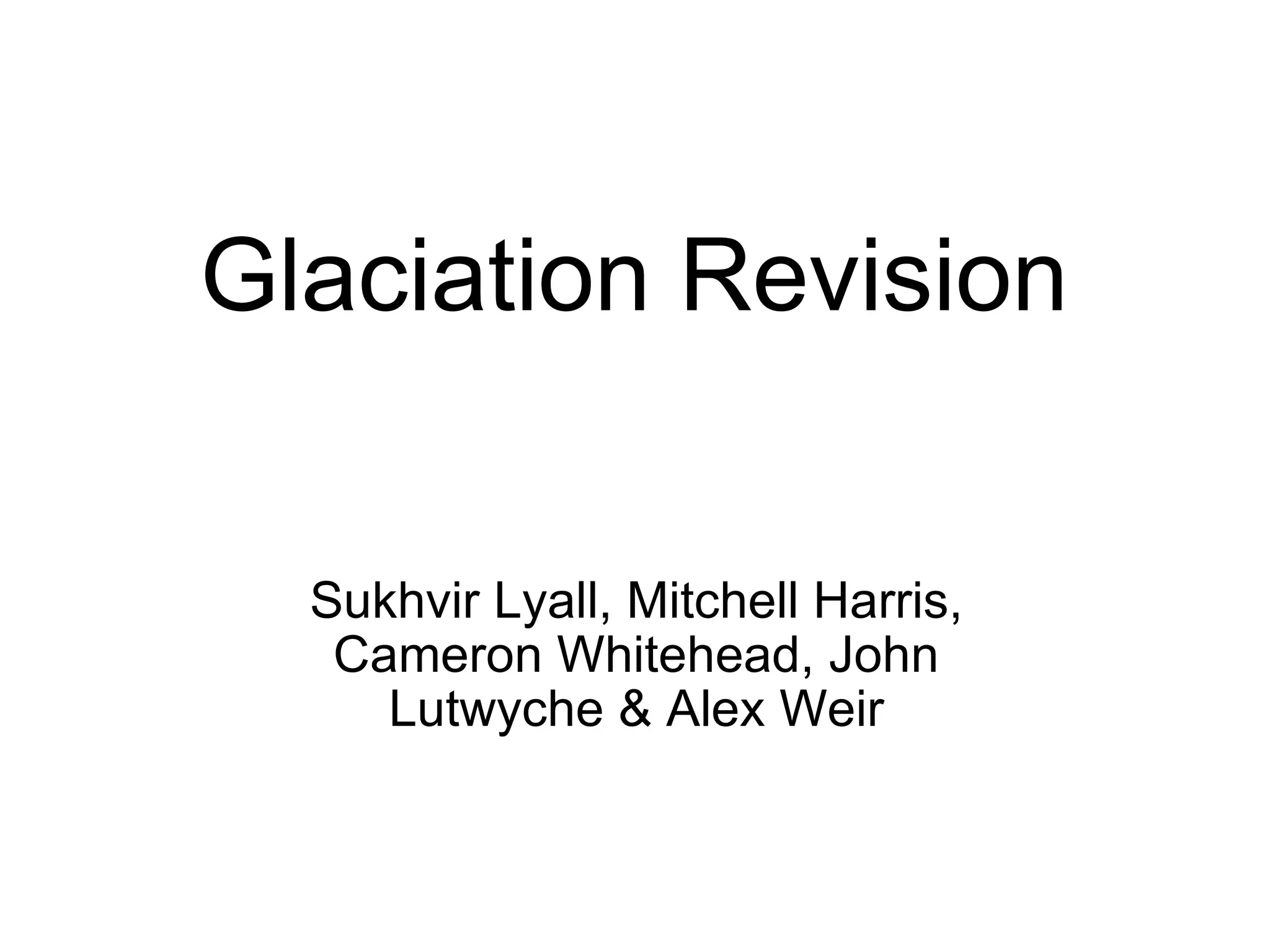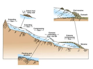 Glaciation features such as corries, aretes, pyramidal peaks, glacial troughs, ribbon lakes, hanging valleys, truncated spurs, boulder clay/till, moraines and drumlins are formed by the glacial erosion processes of freeze-thaw weathering, abrasion, and plucking. Upland glaciated areas are used for farming, forestry, and tourism, but these human uses can cause conflicts over land management with environmental and social issues. Case studies of specific glaciated regions help explain these issues.