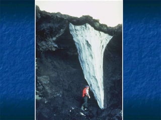 The document describes glaciers and periglacial landforms and processes. It defines different types of glaciers and explains glacial processes like formation, movement, erosion, transportation and deposition. This creates landforms like moraines, drumlins and eskers. Periglacial landscapes lacking glacial ice are also described, featuring permafrost and patterned ground. The Pleistocene epoch is summarized, noting continental glaciation, sea level changes, and paleoclimate studies of past climate variations.