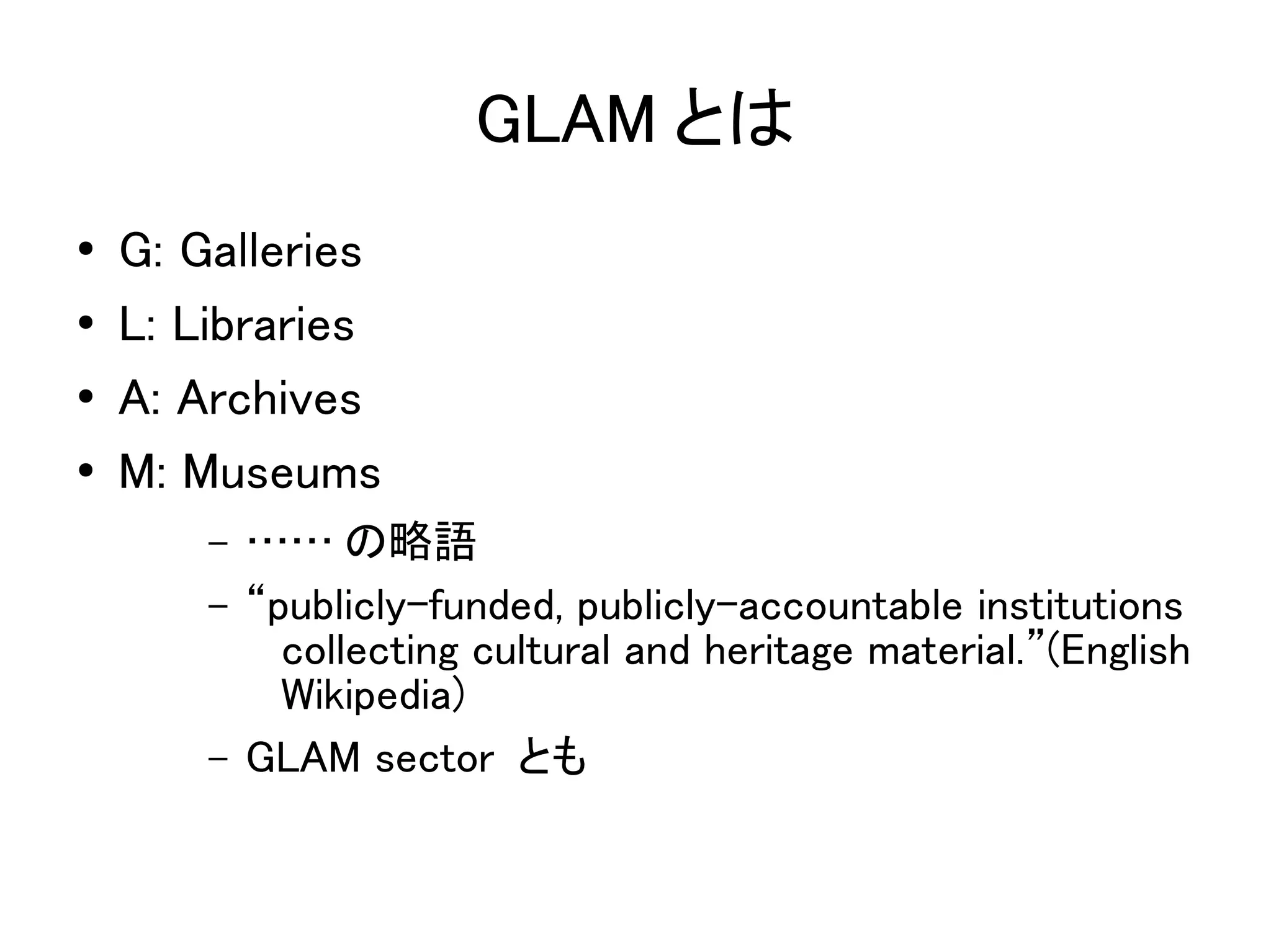 What's GLAM-WIKI? What's GLAM? What's Wikimedia? What can GLAM-WIKI do and have done? This short slideshow will answer those questions. (content is in Japanese)