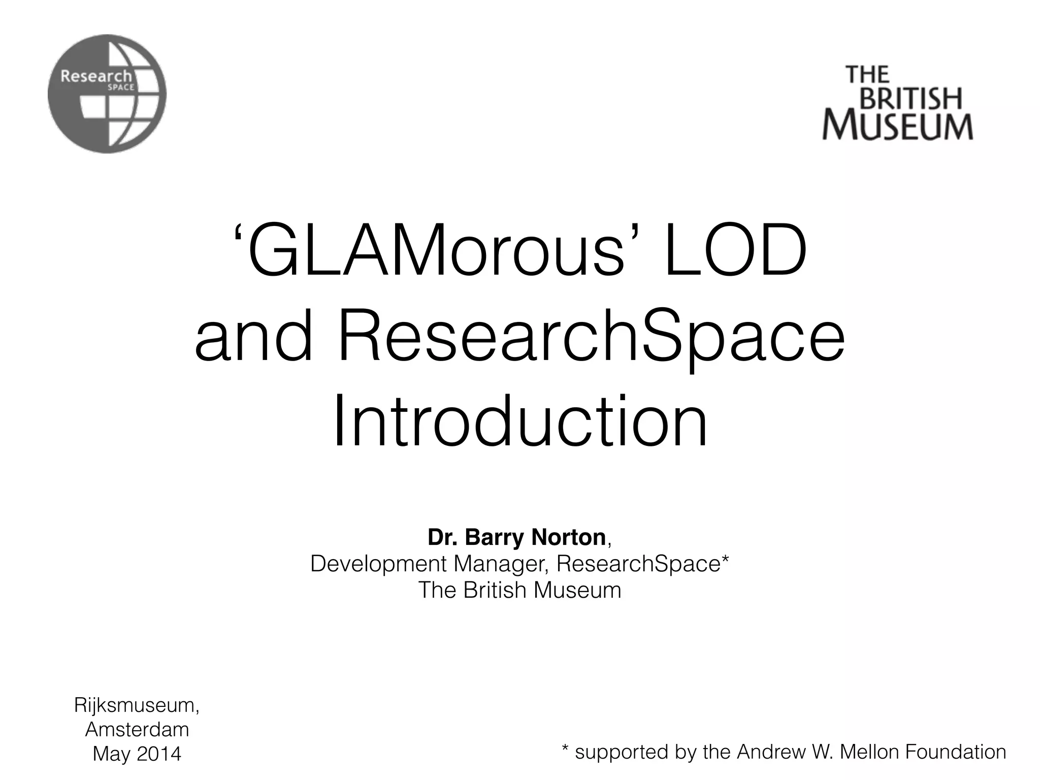 This document discusses the development of ResearchSpace (RS), a platform that allows researchers to make claims by adding to and modifying data from cultural heritage institutions in a way that preserves canonical data. RS components include search, data annotation, image annotation, a "data basket" for collecting items, a dashboard, and conjunctive search. It also discusses fundamental relationships that can be represented in linked cultural data.