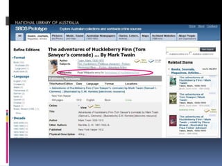 The document discusses the changing role of libraries and information in the digital age. It notes that pre-web, information was produced by large publishers, discovered through metadata created by librarians, and was expensive. Now, information can be produced and described by anyone, found through full-text search and links, and is cheap and distributed. However, libraries are still needed for long-term preservation of content, universal access, and being free from commercial pressures. The role of libraries is evolving as technology enables new forms of collaboration and participation where users can contribute information.