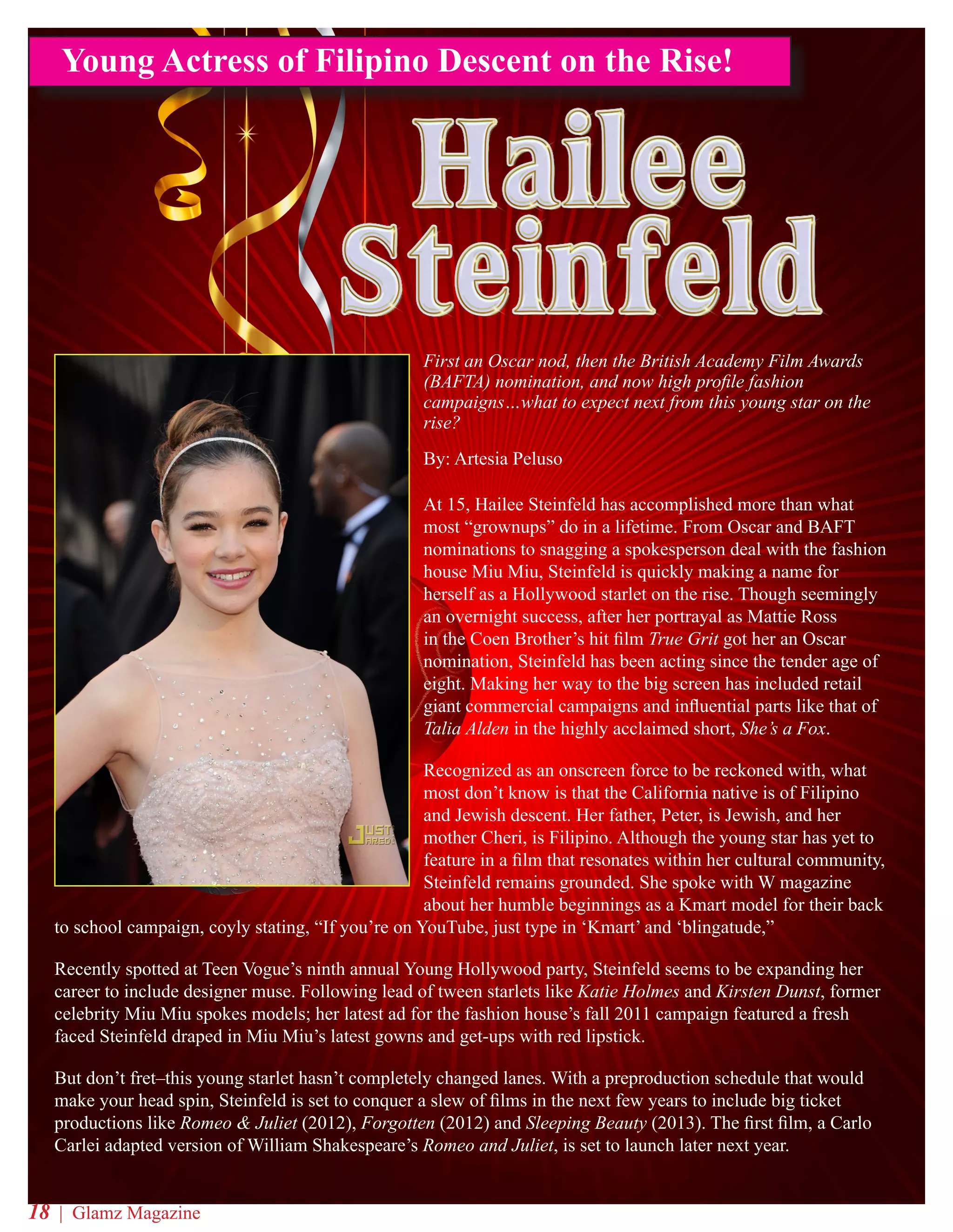 Hailee Steinfeld is a 15-year-old actress who has achieved success early in her career, including an Oscar nomination. Though she has been acting since age 8, her role in True Grit brought her widespread attention. She has since landed fashion campaigns and is of Filipino and Jewish descent. Steinfeld now has several high-profile films lined up in the next few years and is expanding into modeling as the new face of Miu Miu fashion campaigns.