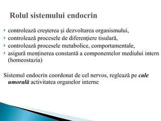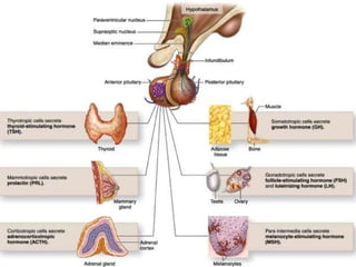Documentul descrie sistemul endocrin, care constă din glandele endocrine ce secreta hormoni în sânge sau limfă, reglează procesele vitale ale organismului, inclusiv creșterea, metabolismul și homeostazia. Hipofiza, principalul organ endocrin, secretă hormoni esențiali precum TSH, ACTH, FSH, LH și prolactina, având roluri variate în dezvoltare și funcționarea organelor. Perturbările în secreția acestor hormoni pot duce la afecțiuni serioase, cum ar fi gigantismul, piticismul sau diabetul insipid.