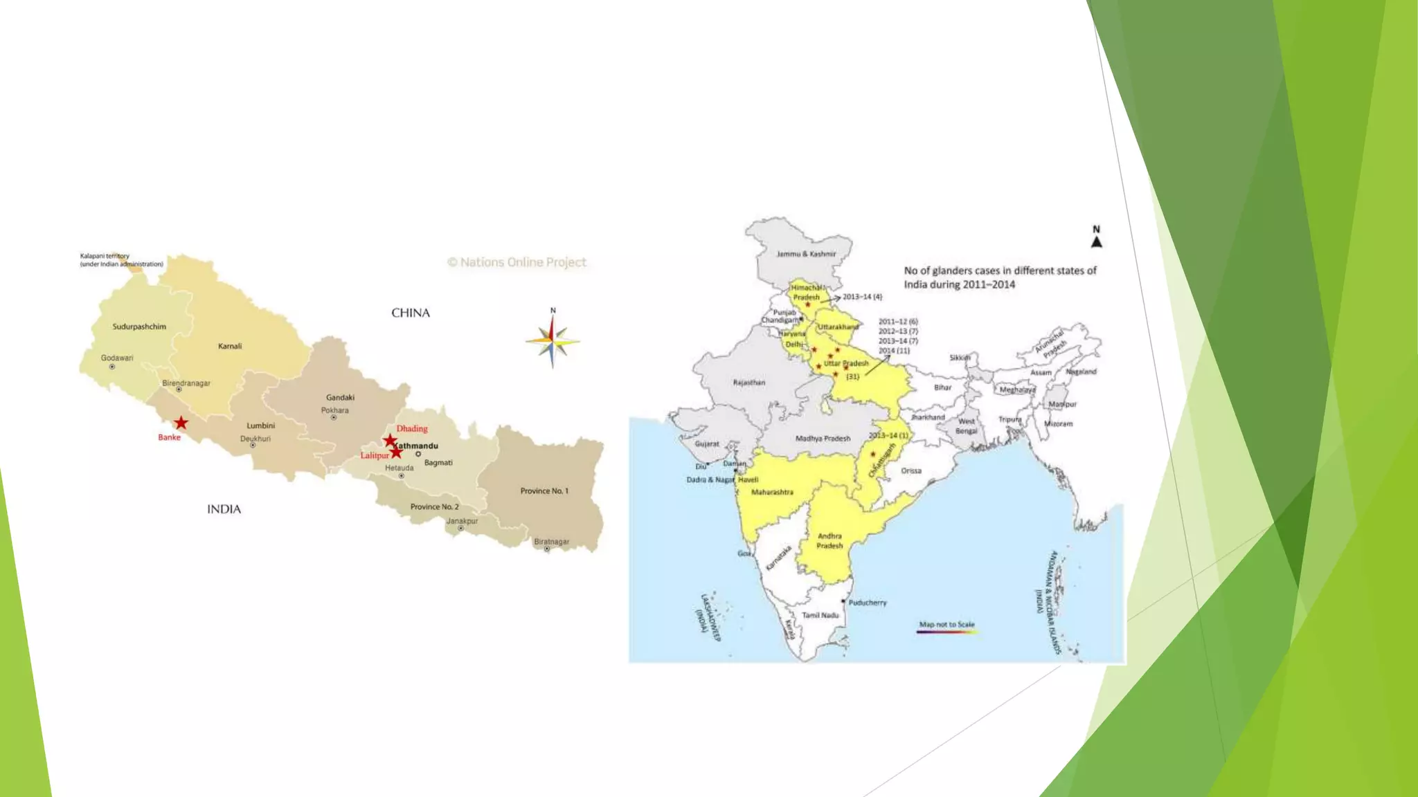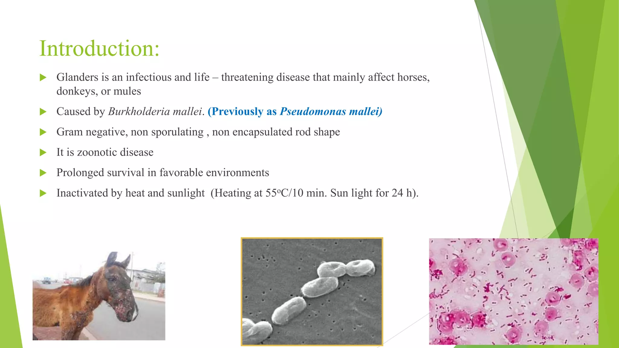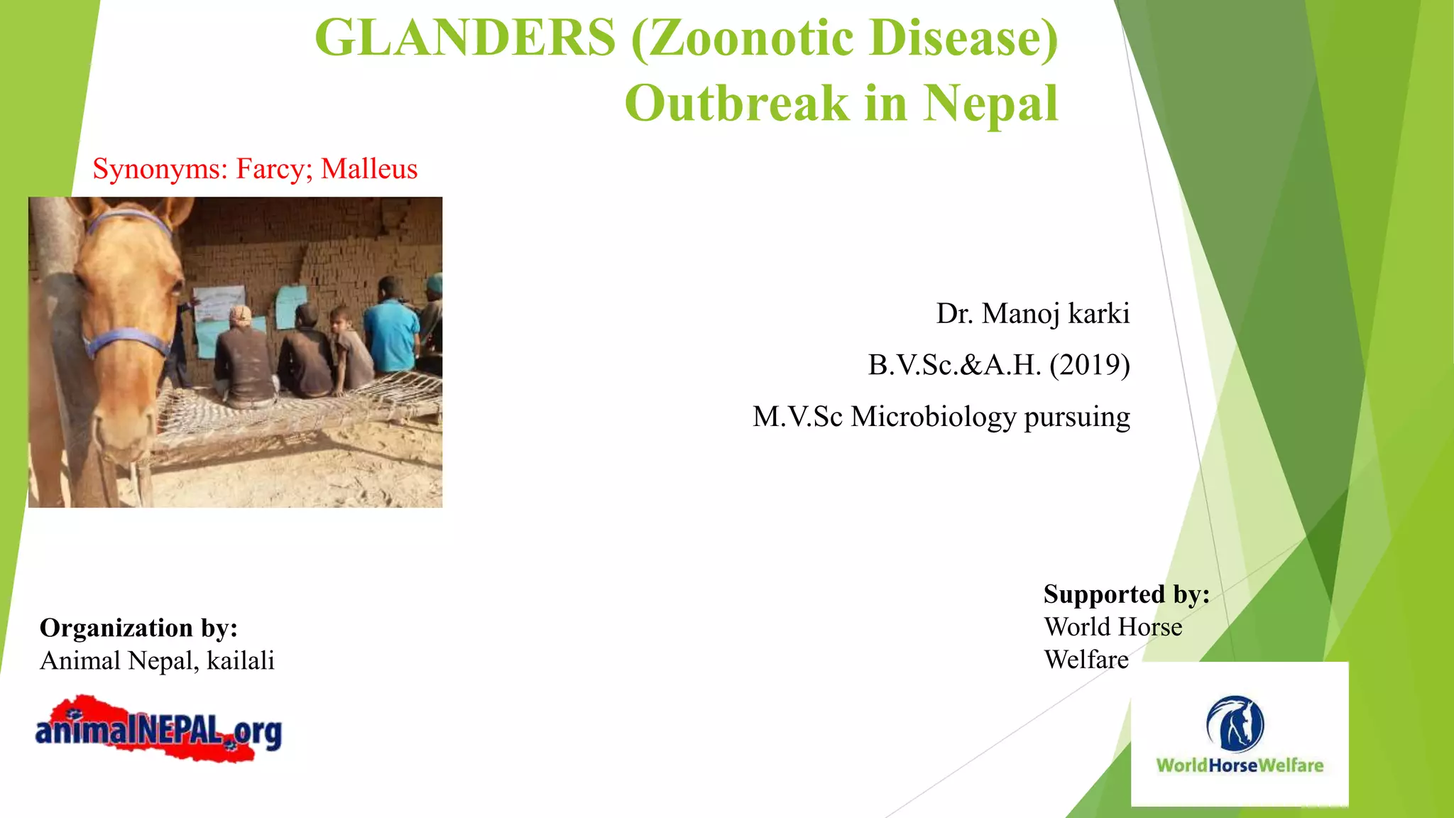 Glanders, caused by the bacterium Burkholderia mallei, is a life-threatening zoonotic disease primarily affecting horses, donkeys, and mules, with its first occurrence reported in Nepal in November 2020. The disease is diagnosed through clinical signs and laboratory tests, poses significant public health risks, and has no existing vaccine, with treatment possible only if administered quickly. Control measures involve early detection, quarantine, and public education to prevent transmission to humans.
