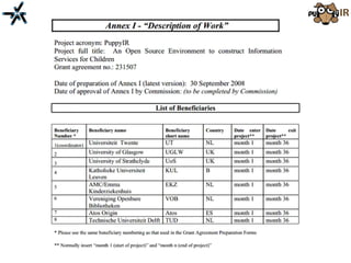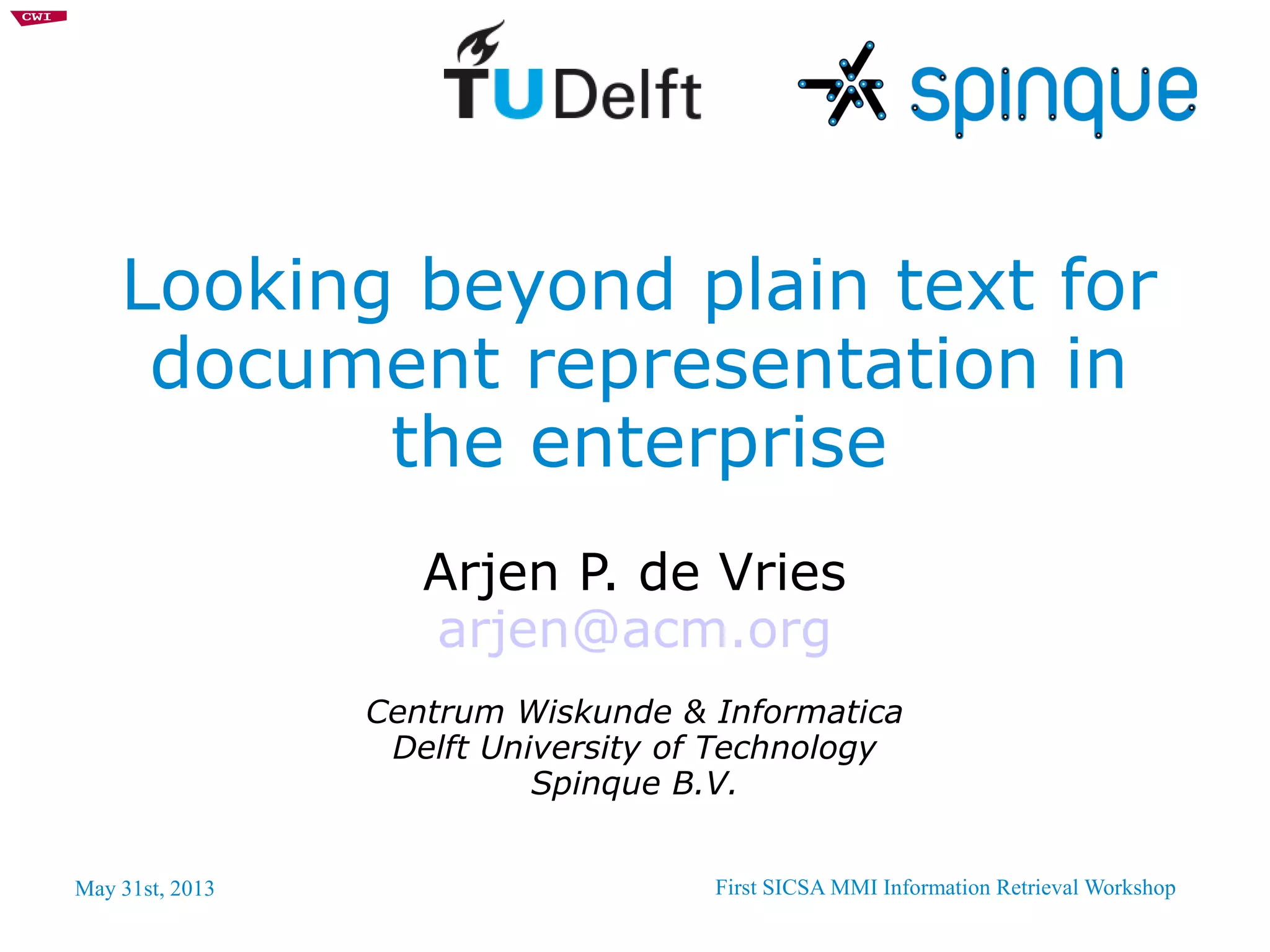The document discusses the need for improved information retrieval in enterprise environments, focusing on integrating structured and unstructured data to meet strategic and business development needs. It highlights the inefficiencies caused by incomplete data and the implementation of effective search strategies using various organizational systems. The workshop emphasizes leveraging existing resources like ERP, CMS, and institutional repositories to enhance document representation and facilitate better access to information across different projects and collaborations.