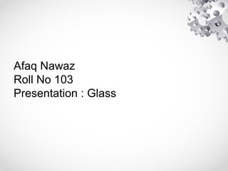Glass is manufactured through a two-step process of batch mixing and melting ingredients at high temperatures, then shaped for various applications. The document discusses types of glass like float glass, which is made through a float process on molten tin; rolled glass, which is poured onto rollers; and toughened glass, which undergoes uneven heating to form protective layers. Laminated glass consists of two glass sheets bonded with a plastic film, making it shatterproof for safety. Glass properties and uses are also outlined.