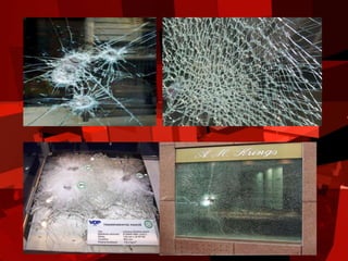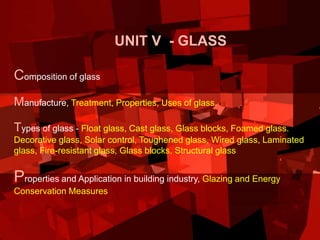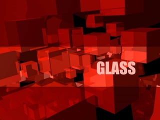 Glass is an amorphous solid made through the melting and cooling of raw materials such as silica sand, soda ash, limestone, and recycled glass. There are many types of glass with different compositions and properties. Glass is manufactured through mixing raw materials, melting in furnaces, fabrication into desired shapes, and annealing to relieve internal stresses. Common glass products include float glass, fiberglass, safety glass, and specialty glasses used for optical, electrical, and scientific applications.