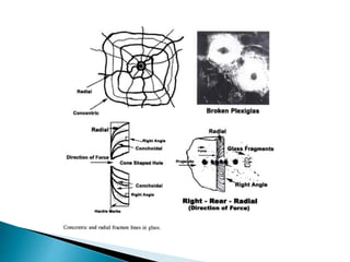 The document discusses different types of glass and forensic analysis of glass evidence. It provides information on the physical, optical, and chemical properties of glass that can be analyzed forensically. Specific techniques mentioned include refractive index testing, density determination, microscopic analysis of fractures, and elemental analysis. The document also discusses how analysis of glass evidence can help reconstruct crime scenes and connect suspects to crimes by matching glass fragments.