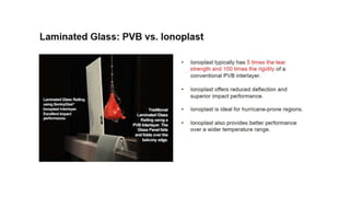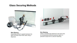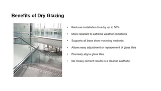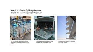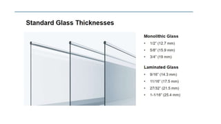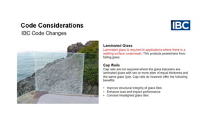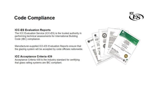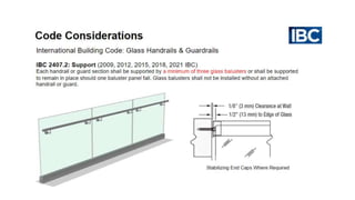 The document discusses the design and application of glass railing systems, highlighting their aesthetic and safety benefits. It covers various types of systems, important considerations for specification, and the role of code authorities. Upon completion, participants will gain a comprehensive understanding of the glass railing specification process, ensuring safety and performance objectives are met.
