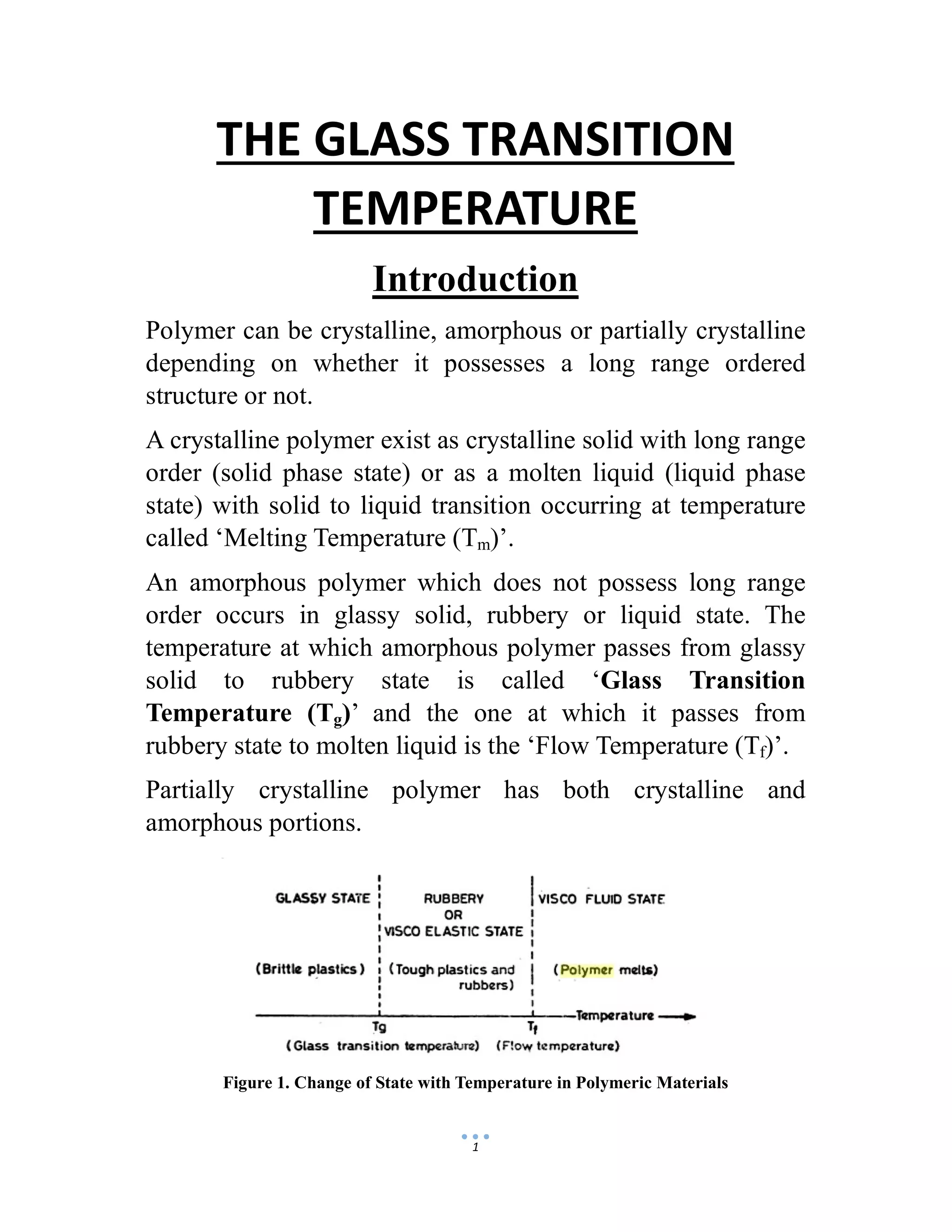 The document discusses the glass transition temperature (Tg) of polymers. Tg is the temperature at which an amorphous polymer transitions from a brittle, glassy state to a rubbery, flexible state. It depends on factors like the polymer's chemical structure, molecular weight, and presence of plasticizers. Knowing the Tg is important as it indicates the physical state of the polymer and suitable processing conditions. It also provides information about the polymer's flexibility and how it will respond to mechanical stresses.