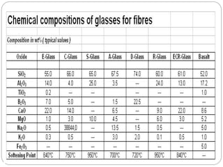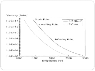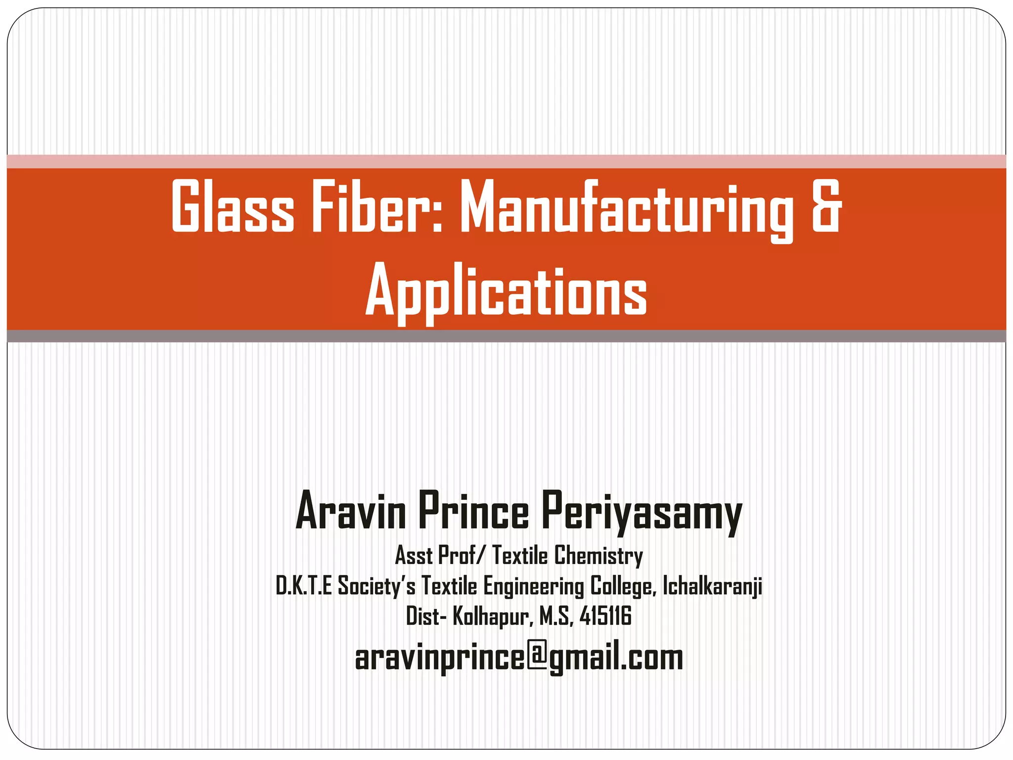 Glass fibers are manufactured through a process of melting raw materials and drawing them into fine fibers for various applications. Raw materials such as silica, alumina and boron are melted together and refined before flowing through bushings with small holes to produce thin glass filaments. These filaments are drawn, quenched, coated with a sizing and gathered into strands. Glass fibers have properties including high strength, stiffness, chemical resistance and stability that make them useful for insulation, reinforcement, filtration and optical applications. Common types include E, S, C and D glass formulated for different end uses.