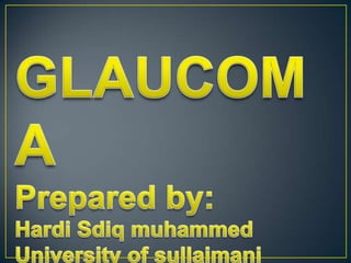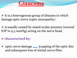 Glaucoma is a group of eye diseases characterized by optic nerve damage, often due to elevated intraocular pressure, and is a leading cause of blindness globally. It is classified into primary forms such as open-angle and closed-angle glaucoma, as well as secondary types stemming from various causes like trauma or other ocular diseases. Treatment options focus on preserving visual function through medications, laser therapy, and surgery, with various classes of drugs available to either decrease aqueous humor production or increase its outflow.