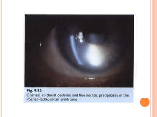 Glaucoma is a disorder caused by increased intraocular pressure damaging the optic nerve. It has two main types - open angle glaucoma where the angle remains open, and angle closure glaucoma where the angle becomes narrow or closed. Angle closure glaucoma occurs when the iris blocks the drainage angle, commonly due to pupillary block or narrowing of the angle with age. It presents with sudden severe eye pain, blurred vision, headache, and eye redness. Gonioscopy is used to examine the angle structure and grade its width.