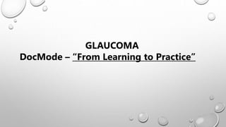 This document provides an overview of glaucoma, including what it is, its causes and risk factors, types of glaucoma, symptoms, treatments and prevention. Glaucoma is caused by a buildup of fluid pressure in the eye that damages the optic nerve if not treated. It is usually treated initially with eye drops but may require surgery if drops are not effective. Regular eye exams are important for early detection and treatment to minimize vision loss.