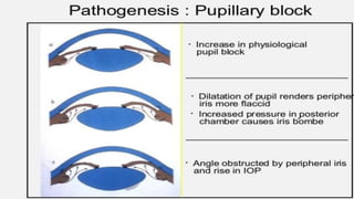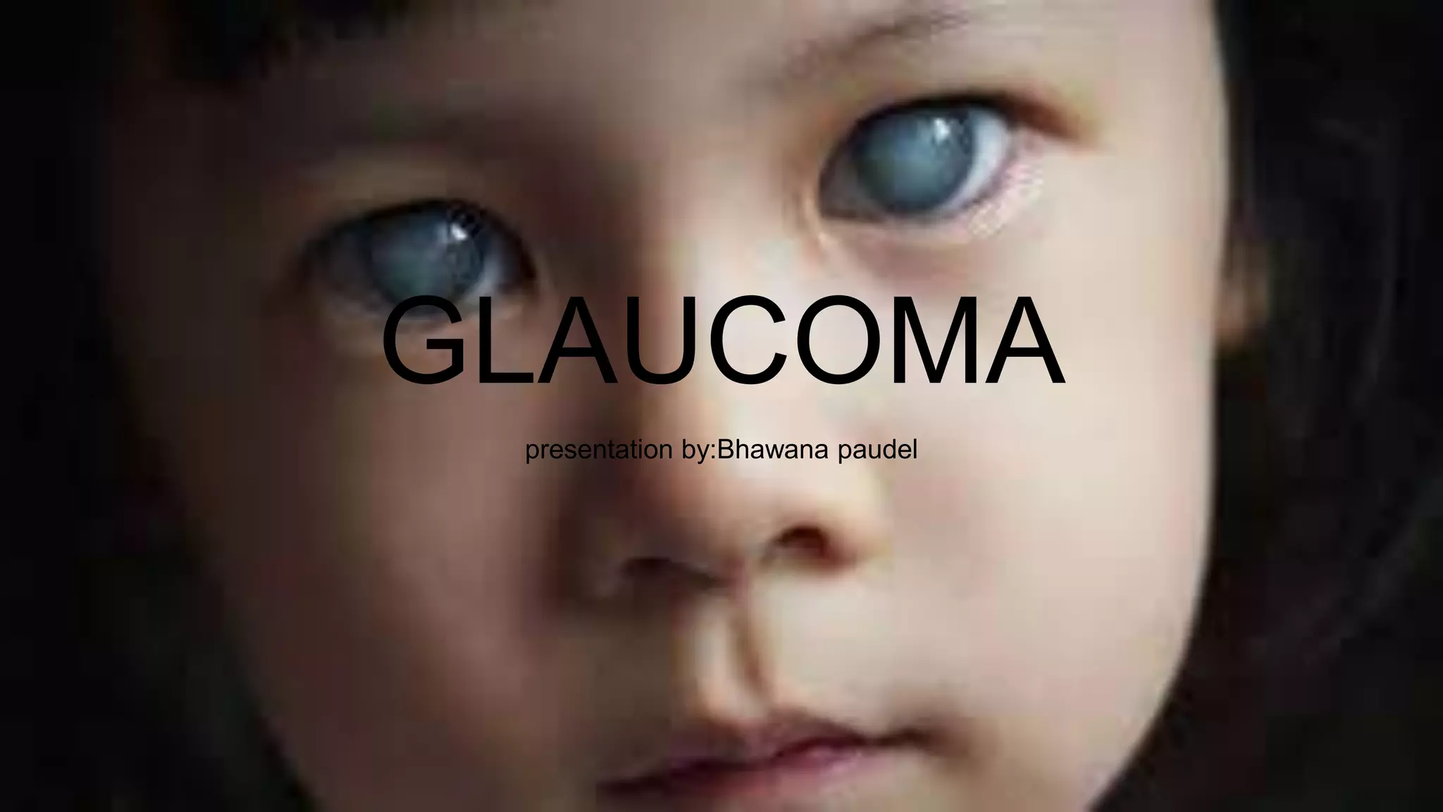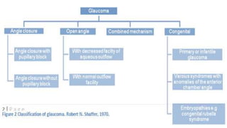 Glaucoma is a group of eye disorders characterized by optic nerve damage and vision loss caused by increased pressure in the eye. The document discusses the definition, epidemiology, causes, clinical features, diagnosis, and management of primary open angle glaucoma and primary angle-closure glaucoma. Key points include that glaucoma has various clinical manifestations, causes include blockage of aqueous outflow, signs involve optic nerve changes and visual field loss, and treatment aims to lower intraocular pressure through medication, laser treatment, or surgery.