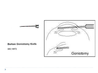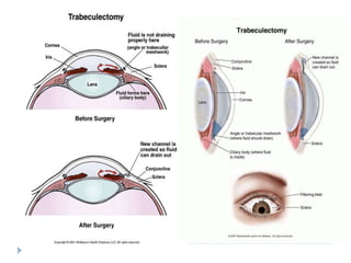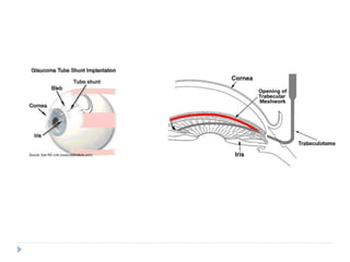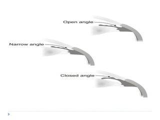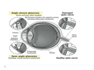 Glaucoma is a group of eye diseases that damage the optic nerve and causes vision loss and blindness. It is often asymptomatic in the early stages. The main cause is increased pressure within the eye (intraocular pressure) due to impaired fluid drainage from the eye. There are two main types - open angle glaucoma which develops slowly over time and closed angle glaucoma which is a medical emergency with sudden severe eye pain. Treatment aims to reduce intraocular pressure and halt further optic nerve damage.