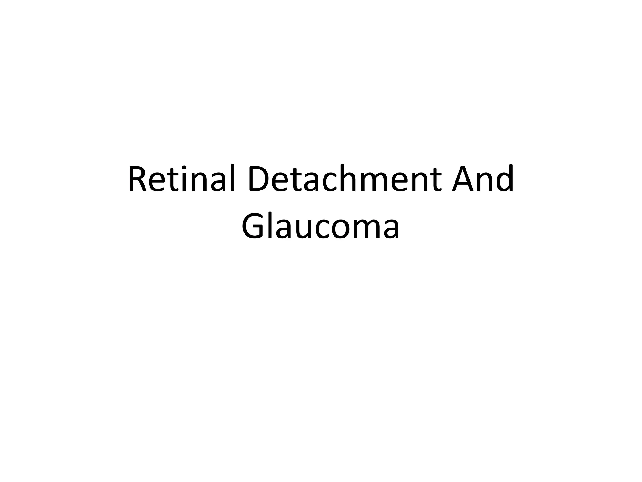 The document discusses retinal detachment and glaucoma, detailing their types, causes, symptoms, diagnosis, and treatment options. Retinal detachment occurs when the retina separates from its supporting tissue, with common causes including age and diabetes, while glaucoma is characterized by optic nerve damage typically linked to increased intraocular pressure. Management strategies include medical, surgical, and nursing interventions aimed at preventing vision loss and addressing complications.