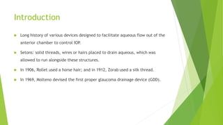 Glaucoma drainage devices are implants used to drain aqueous humor from the anterior chamber to control intraocular pressure. They consist of a silicone tube extending from the anterior chamber to a plate beneath the conjunctiva. Open tube designs like Molteno and Baerveldt and flow-restricted designs like Ahmed are commonly used. GDDs are generally used when filtering surgeries have failed or are likely to fail. While they effectively lower IOP, complications can include hypotony, elevated IOP, migration or erosion of the device, and diplopia. Long-term studies show success rates of 65-85% in maintaining IOP control.