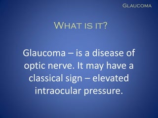 Glaucoma is a disease of the optic nerve that can lead to irreversible blindness if left uncontrolled. It is often asymptomatic until severe vision loss has occurred. The most common type is primary open-angle glaucoma, which occurs when the eye does not properly drain fluid, leading to elevated pressure in the eye. Treatment aims to lower intraocular pressure through medications, laser treatment, or surgery in order to slow the progression of vision loss. While glaucoma continues progressing even with treatment, the rate of progression is much slower, allowing for satisfactory vision with proper management.