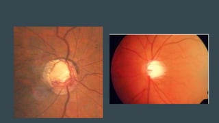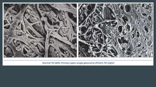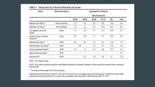 This document provides guidelines and information on glaucoma. It begins by outlining the preferred practice patterns for open angle glaucoma by the AAO and Canadian glaucoma guidelines. It then defines primary open-angle glaucoma and discusses clinical objectives such as monitoring optic nerve structure and function. Risk factors like elevated IOP, age, family history and type 2 diabetes are examined. The diagnostic process involving tests like visual fields, pachymetry and optic nerve imaging is summarized. Examination techniques like gonioscopy and optic nerve evaluation are also overviewed.