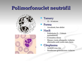 Polimorfonuclet neutròfil Tamany12 - 14 micres Forma Arrodonit, ben defint Nucli Polilobulat (2 – 3 lòbuls normalment) Cromatina densa Masses vioeta allargades violàcies alternades amb zones més clares Citoplasma Acidòfil rosa clar Nombroses granulacions violàcies