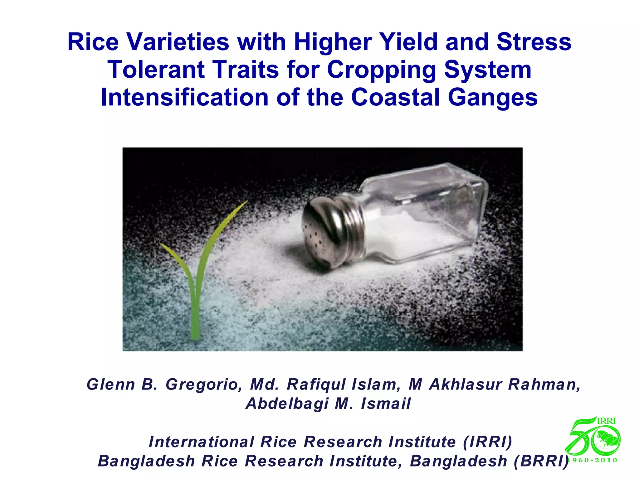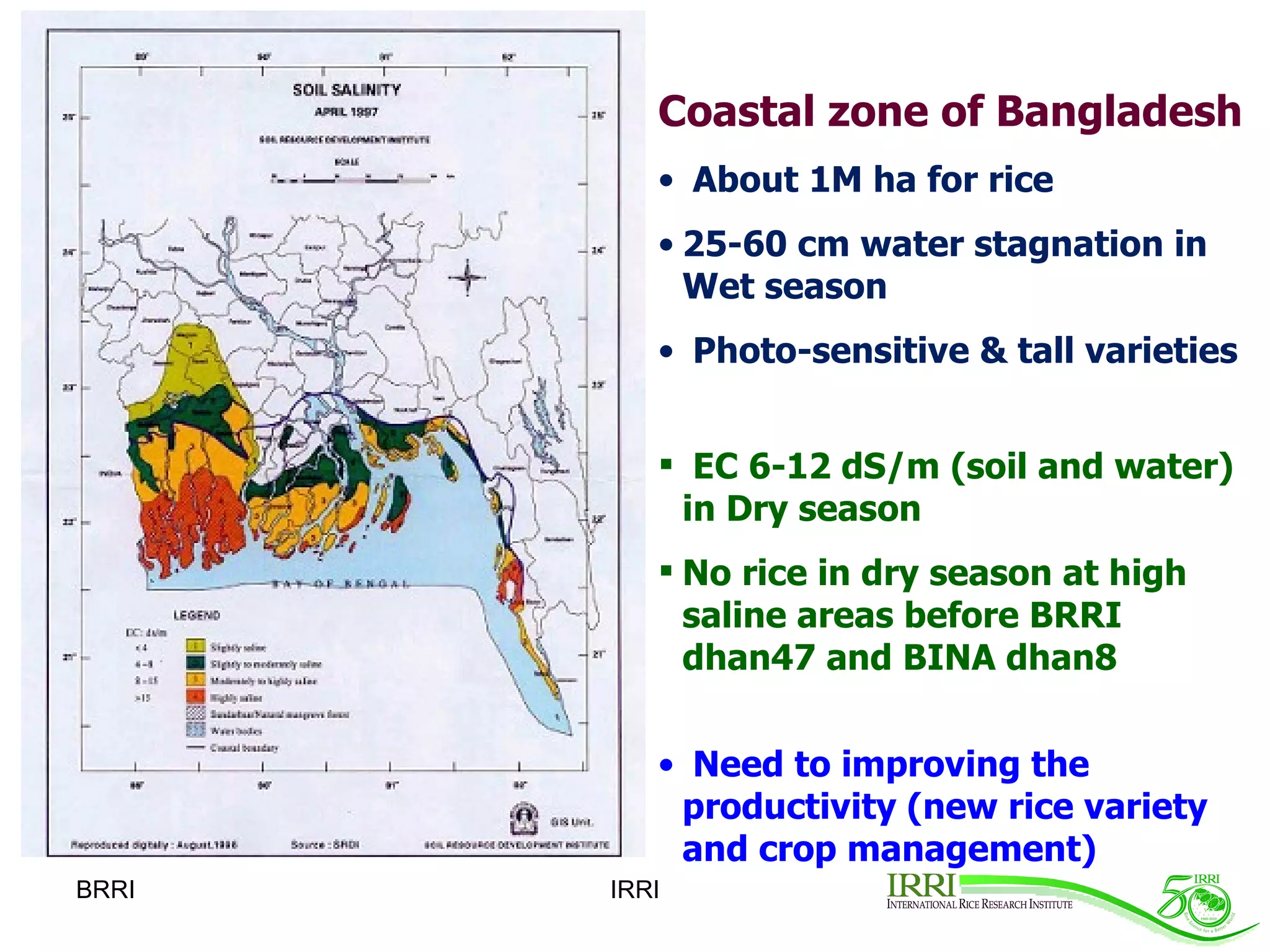 The document discusses rice varieties developed for cropping systems in coastal Bangladesh that are tolerant to various abiotic stresses including salinity, submergence, and flash flooding. It provides a table listing rice varieties suitable for coastal areas and their traits. It also summarizes research conducted to develop new rice varieties such as BRRI dhan47 through marker-assisted backcrossing that can tolerate higher salinity levels and stabilize productivity in coastal regions.