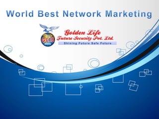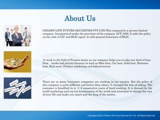 Golden Life Future Securities Pvt. Ltd. is an Indian private limited company that sells life insurance policies from LIC and RLIC. It also sells general insurance from RLIC. The company helps customers obtain loans from banks and private lenders. It claims to have a different and better insurance policy approach than other companies that benefits customers. The company also operates a multi-level marketing business opportunity for individuals to earn income by recruiting others.