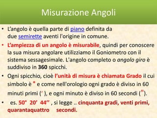 Il documento spiega la misurazione degli angoli mediante il goniometro, descrivendo le unità di misura angolari e i diversi tipi di angoli come acuti, retti, ottusi e piatti. Viene inoltre fornita una classificazione degli angoli in base alla loro somma, come angoli complementari, supplementari ed esplementari. Infine, si introducono i concetti di angoli concavi e convessi, nonché angoli opposti al vertice.