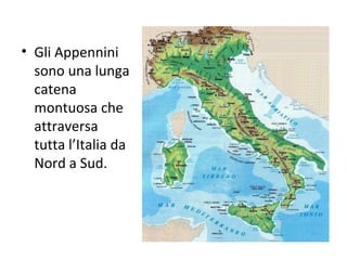 Gli Appennini sono una catena montuosa che attraversa l'Italia da nord a sud, suddivisa in tre gruppi principali: settentrionale, centrale e meridionale. Le montagne degli Appennini sono di minore altezza rispetto alle Alpi, con cime arrotondate che non superano i 3000 metri, e ospitano vulcani nell'area meridionale, come l'Etna e il Vesuvio. I fiumi che scorrono nella regione sono corti e poco voluminosi, alimentati principalmente dalle piogge, e vi sono anche laghi di origine vulcanica, soprattutto nella regione Lazio.