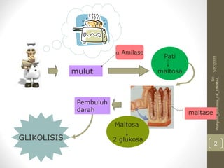 Glikolisis adalah jalur metabolisme yang mengubah glukosa menjadi piruvat, menghasilkan ATP dan NADH, serta berfungsi sebagai sumber energi utama, terutama bagi eritrosit. Proses ini melibatkan 10 langkah yang dikendalikan oleh beberapa enzim kunci seperti heksokinase dan fosfofruktokinase, serta berfungsi dalam sintesis asam amino dan trigliserida. Glikolisis juga dapat berlanjut ke proses anaerob, menghasilkan laktat sebagai produk akhir di lingkungan hipoksia.