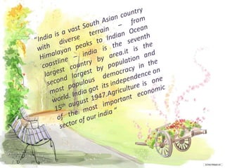 India originated important fields like algebra, trigonometry and invented the number system including zero. It is the world's largest democracy and exports software to 90 countries. Several major religions originated in India like Hinduism, Sikhism, Buddhism, Jainism and Islam is India's second largest religion. India has a diverse landscape and culture with many states mentioned like Agra, Odisha, New Delhi, Bihar, and Madhya Pradesh.