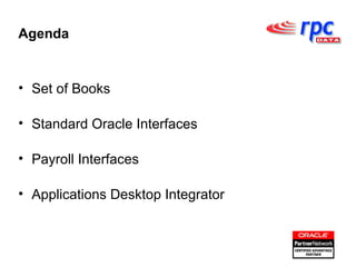 The document discusses interfacing payroll and other transactional data from feeder systems into the Oracle General Ledger. It describes the standard Oracle interfaces used for journal import, including the tables and steps involved. It also provides an overview of how payroll elements are defined and processed, and how the payroll interface links to the General Ledger tables.